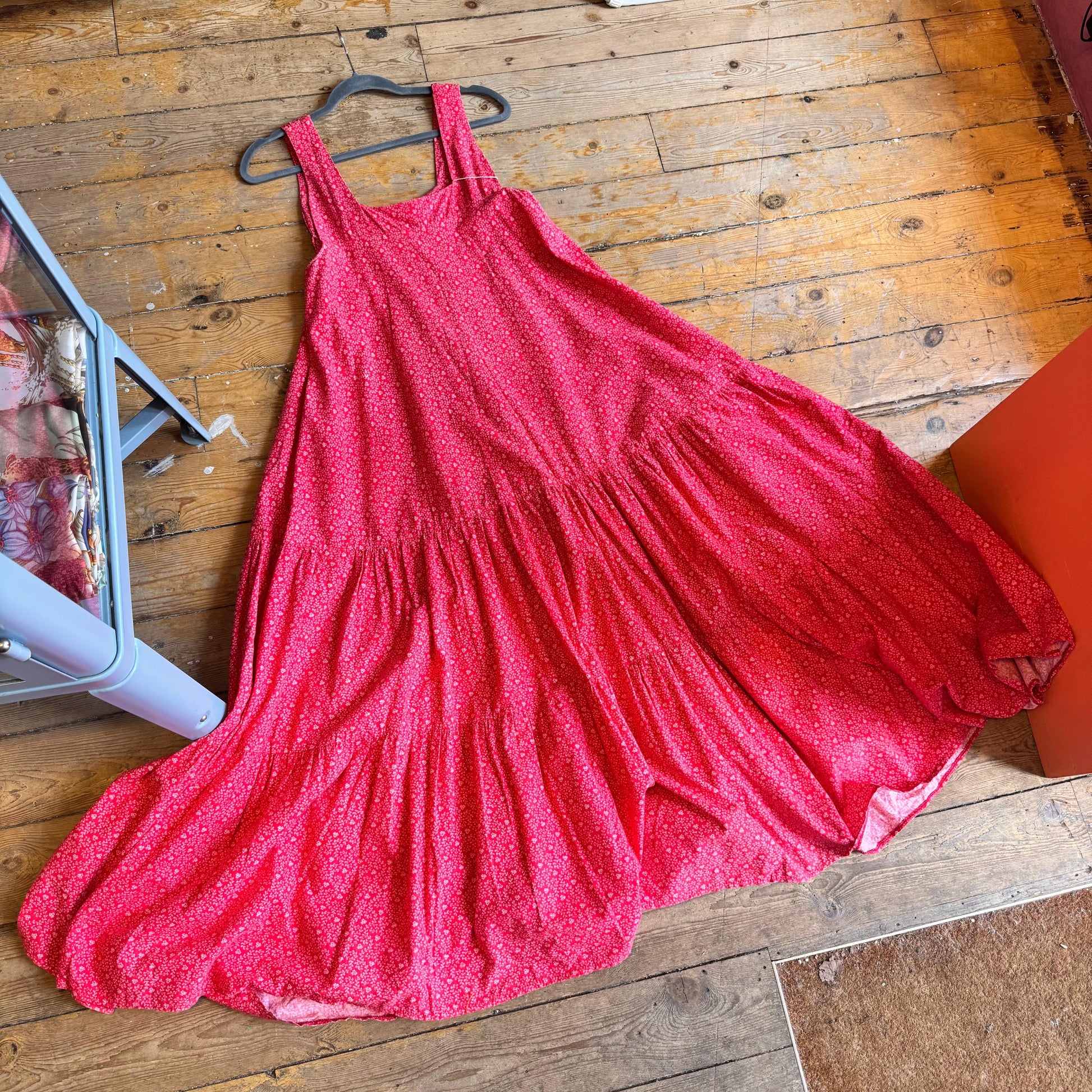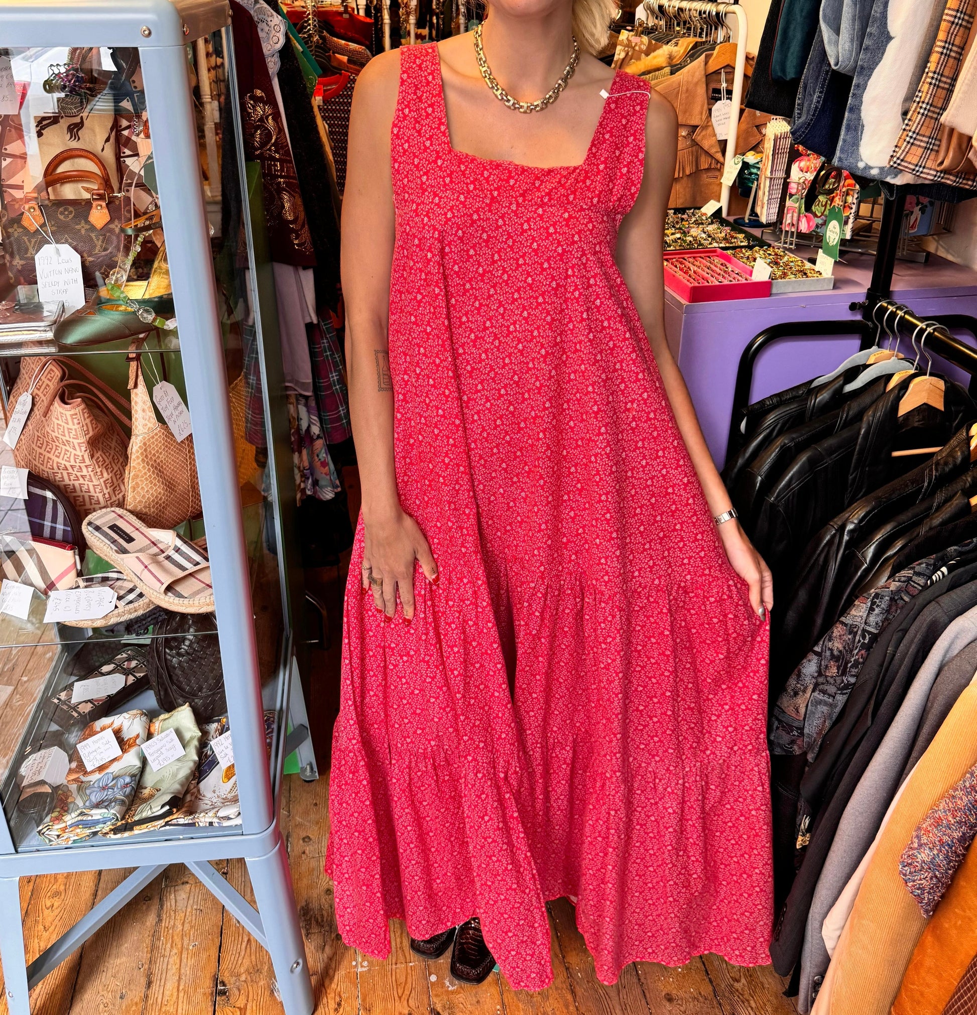 Turn heads in this 1970’s flirty, flowy number. Featuring a square neckline and full skirt, the layered design paired with the classic red and white ditsy floral print crates the perfect summer dress. Crafted from high quality thick cotton.
