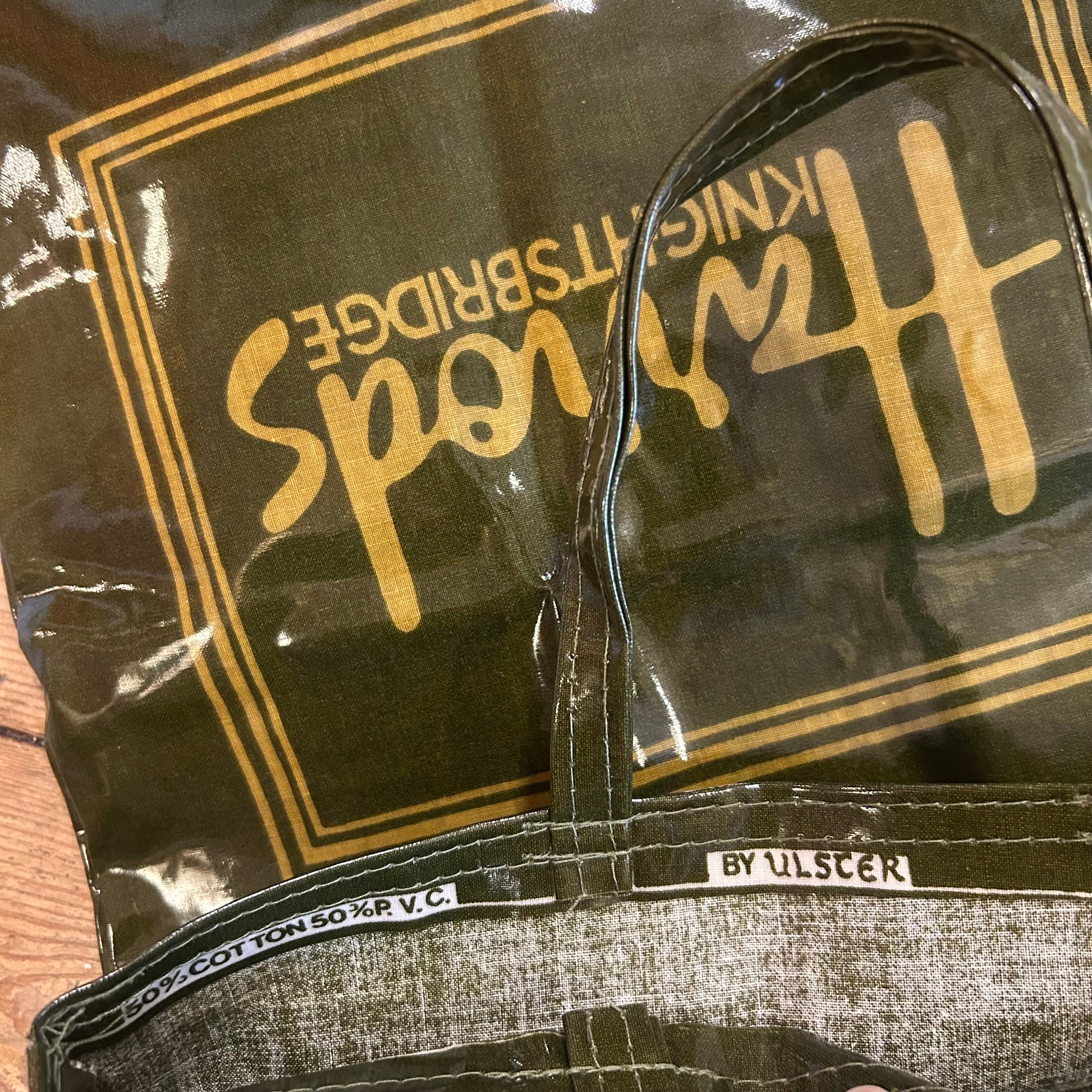 1970’s Harrods Knightsbridge Tote. Dark green oilcloth with iconic gold lettering. Practical, chic and ready for adventure.