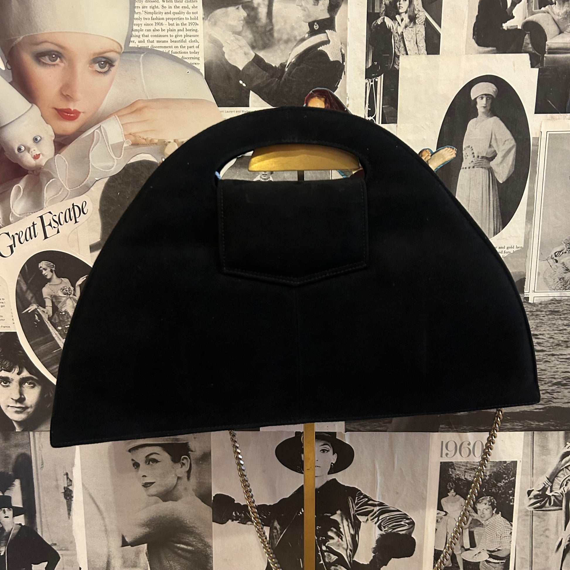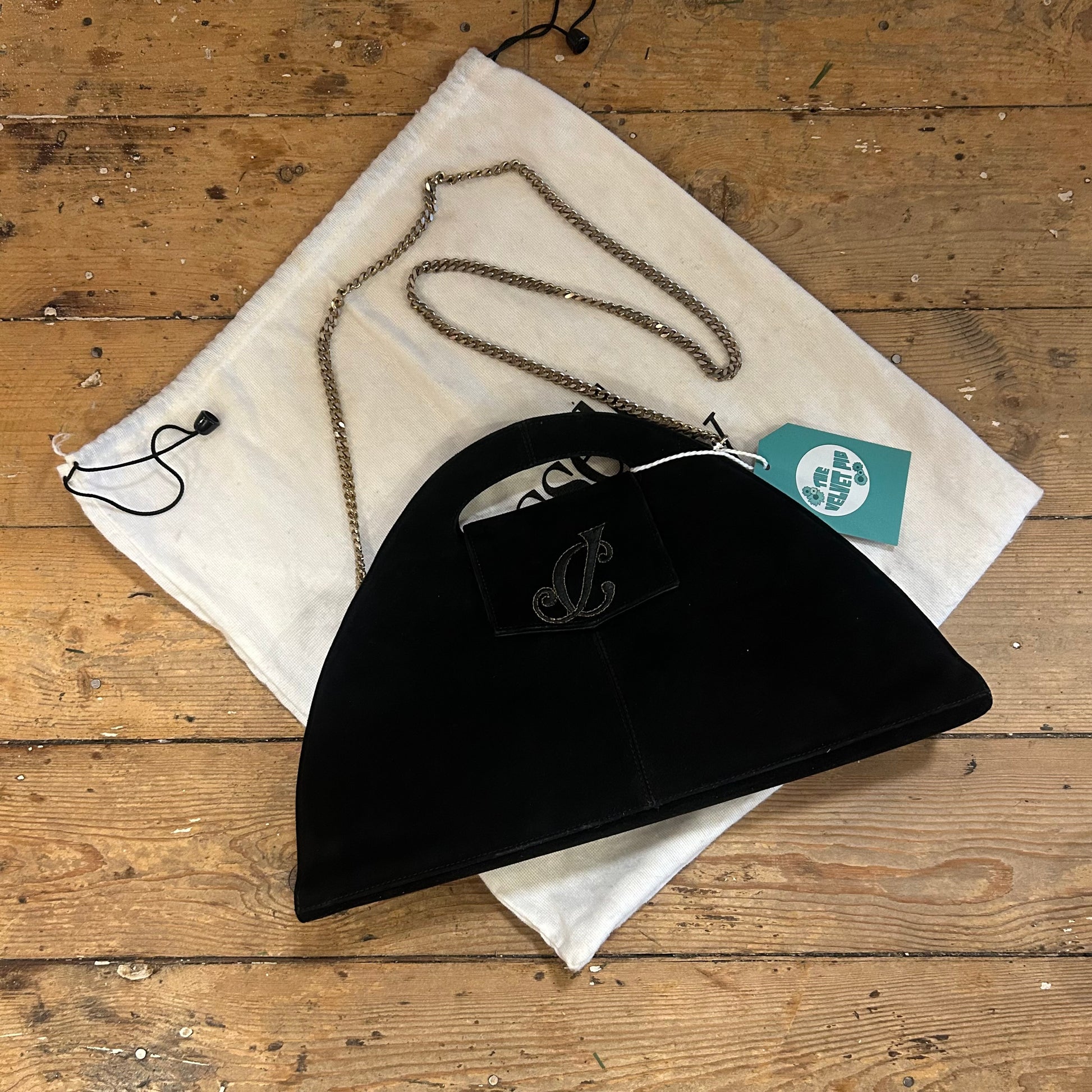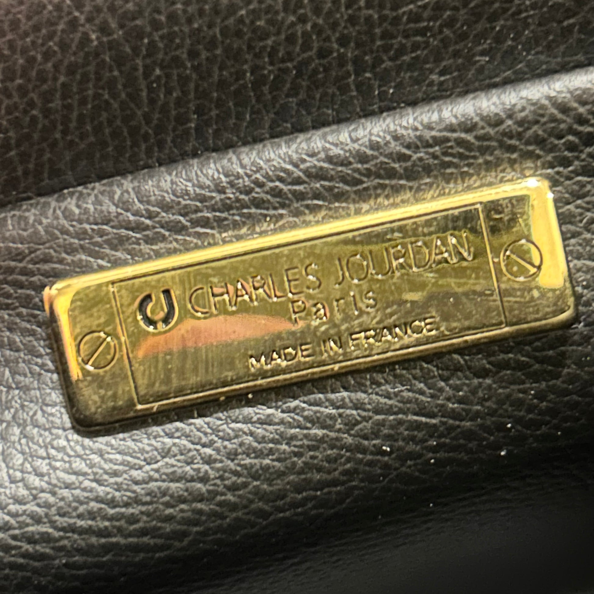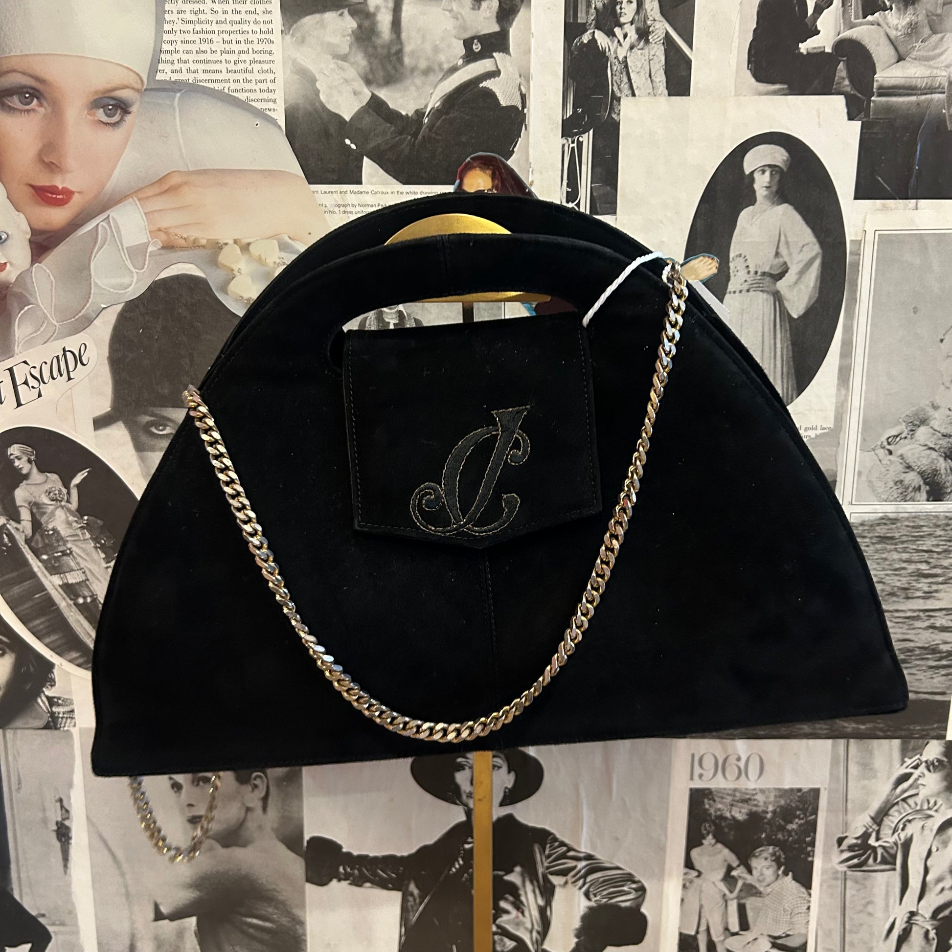 This 1980’s shoulder bag by Charles Jourdan features ultra soft suede, removable shoulder chain, top handle and gold tone CJ embroidered monogram.