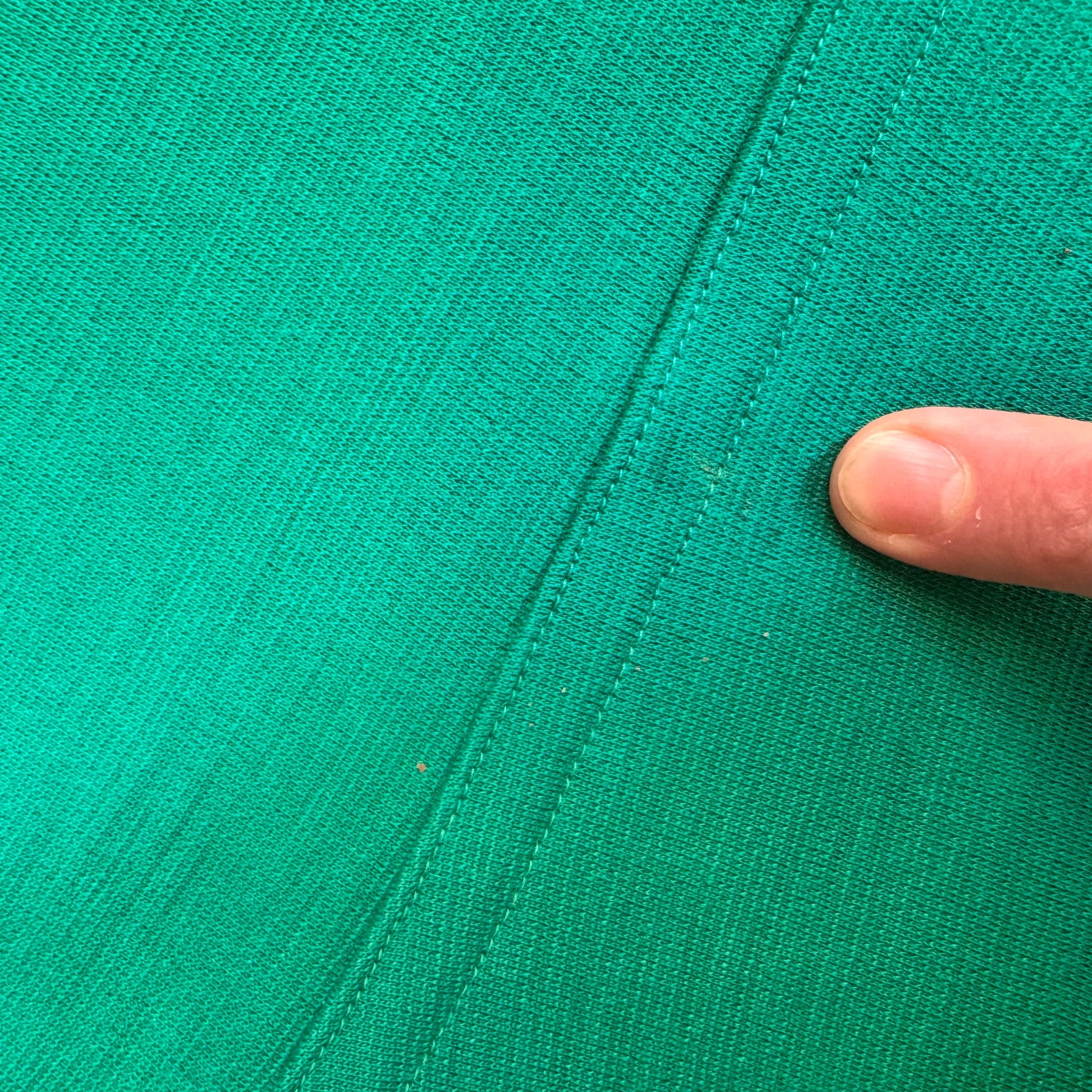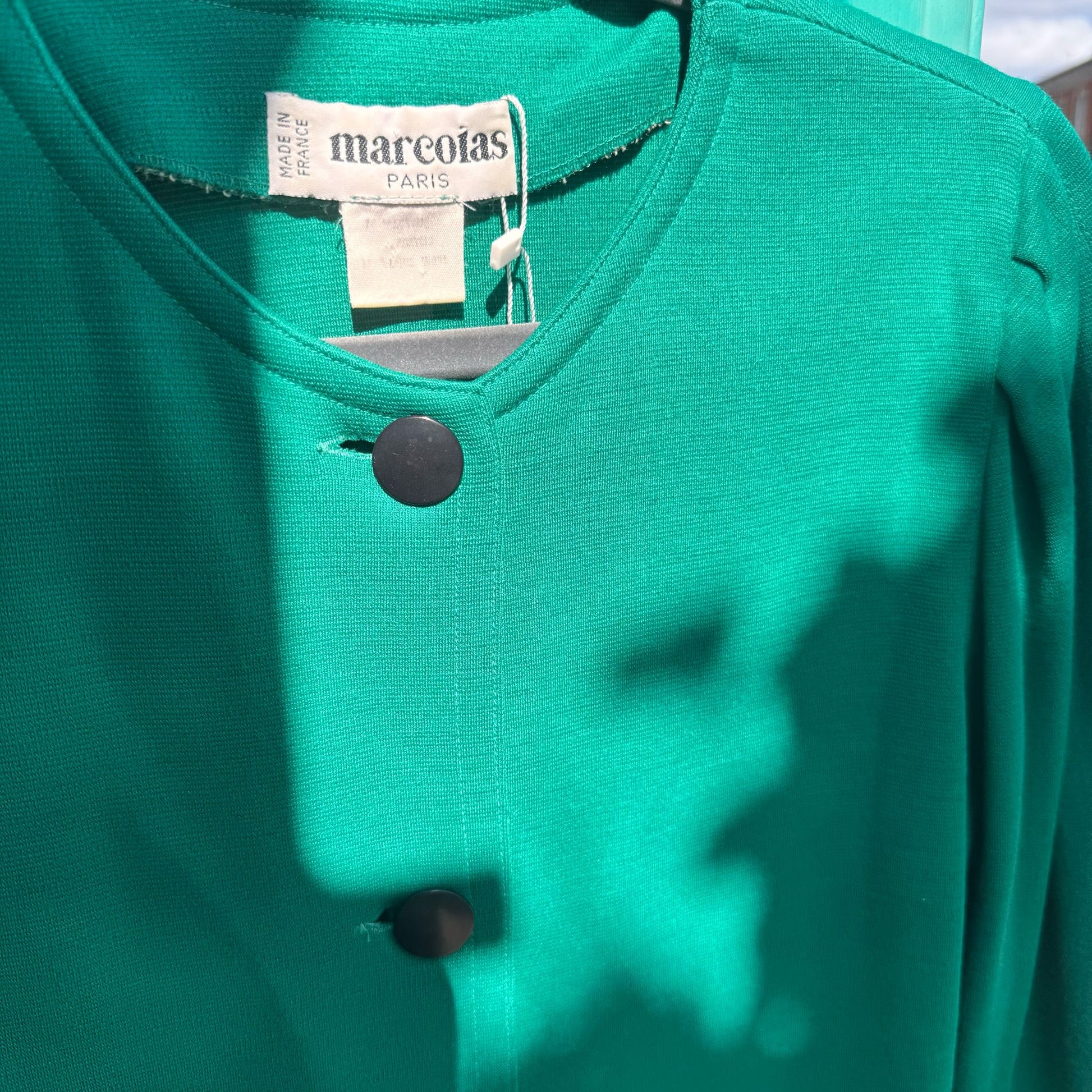 This 1980’s Marcoias Paris dress is the perfect shade of emerald green, with its drop waist, and button front, it’s fun yet versatile. Pink belt not included.