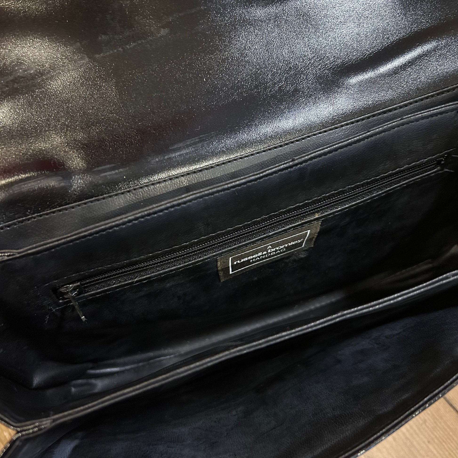 This 1980’s Black patent leather handbag by Russell & Bromley features gold and silver two tone clasp, ultra shiny soft leather and three inside sections plus zip compartment.