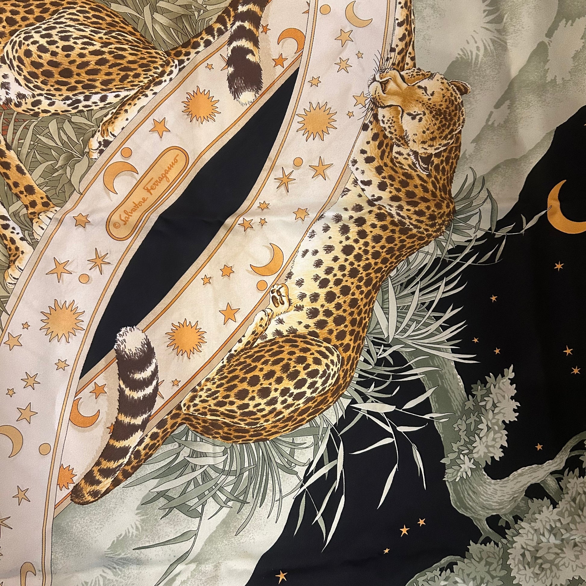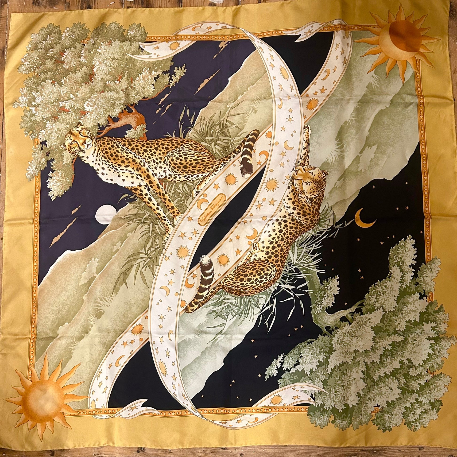 This 1980’s Salvatore Ferragamo silk scarf in their iconic Day & Night print features leopards, suns, moons and stars. The perfect accessory both collectible and stylish.